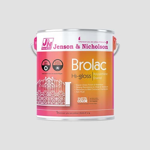 Hi-Gloss Brolac Polyurethane Enamel is a high-gloss paint with outstanding film integrity and inherent durability. It provides a long-lasting, luxurious, dazzling glossy finish with abrasion and chemical resistance properties. This paint is recommended for use on metal, masonry surfaces, and wood surfaces. The best benefits of Brolac Hi-gloss are Hi-gloss finish & Retention, Strong resistance to wear & abrasion, Resistant to mild corrosive chemicals. It is available in more than 1600+ shades as per the sheenlac Fan Deck. Available in 500ml to 20L.  We deliver all types of Paints & Finishes Online at Best Price in Hyderabad.